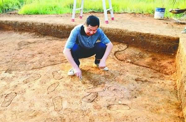 随后,考古队员们在这个“脚印”的旁边,发掘了10平方米面积、10多厘米深的土层,发现了26个“脚印”。