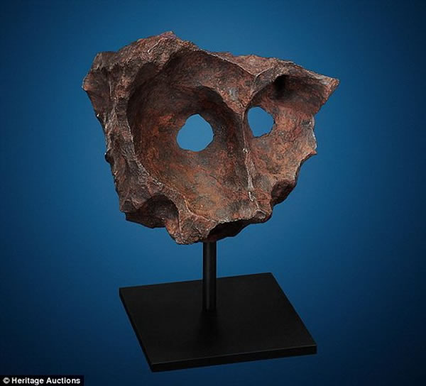 目前美国拍卖一块奇特陨石,它的两个洞状结构非常罕见,颇似人类面具,也有点儿像一只猫头鹰面部