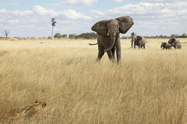 那些狮子发现了我们,于是变更了它们的路线。等到我们回到车上时,羚羊已经从那儿逃离,而象群与狮群发生了对抗。狮子一般不会袭击成年的大象,但是它们有时候会捕食大象幼崽。当我们坐在车中接近它们时,发现一头公象向一只狮子冲了过去,其他狮子则在旁看着。公象继续追着那只狮子,把它困住,好让更小、速度更慢的大象与这些超级捕食者拉开一些距离。
