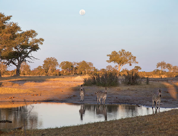 黄昏,万盖(Hwange)国家公园,月亮冉冉升起,斑马们围在一个水塘边。