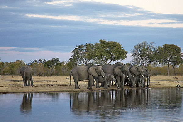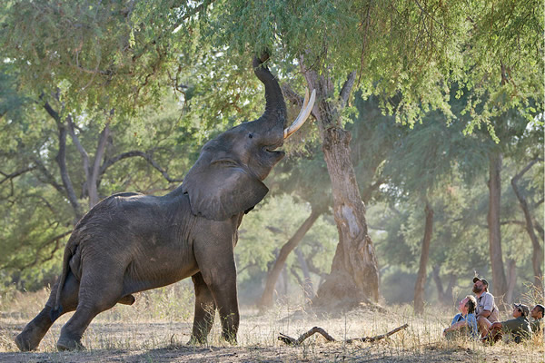 在津巴布韦的邻国,观赏大型猎物常常会引发几十辆车子排队竞相争抢最佳观赏点。与此形成对照的是,在津巴布韦,只有你和动物们呆在一起。我们在万盖公园的本地向导迪克森(Dixon)呆在车子的后座,在我和克里斯坦森走向那个水塘时,他则用双筒望远镜扫视着地平线。在我们靠近那些大象时,他拿出一个装着细白灰的软塑料挤瓶,喷了一些灰在空中测定风的方向。我们处于下风处,没有被象群察觉,我们迅速悄悄地走完了余下的路。当我们更加接近象群时,克里斯坦森示意我跪到地上,于是我跪了下来,拿出我的双筒望远镜看着大象们在水塘喝水、与它们的幼崽四处喷水。有几头大象突然从水里抬起头来。克里斯坦森说,“它们可能看到我们了,呆着别动。”