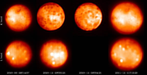 木卫一上观测到的几起不同波长下明亮爆发,顶部是短波长(2.1毫米),底部是长波长(3.2毫米)。自2004年起利用的是凯克10米望远镜(2004年5月,2007年8月,2007年9月,2009年7月)、双子座北8米望远镜(2007年8月)和欧洲南方天文台VLT-Yepun8米望远镜和它们的自适应光学系统。