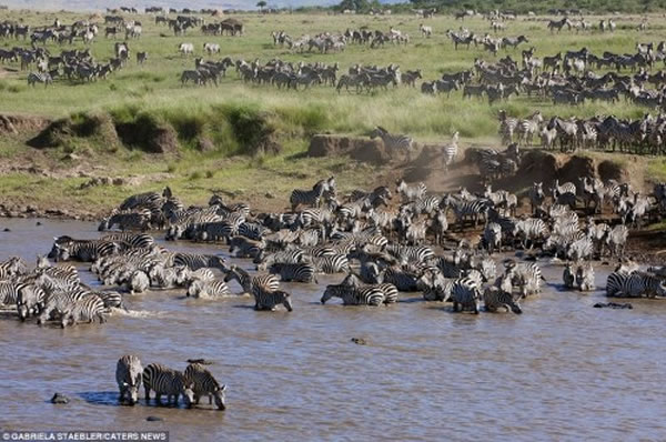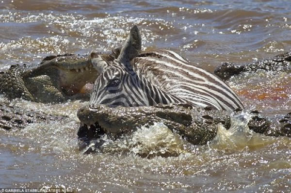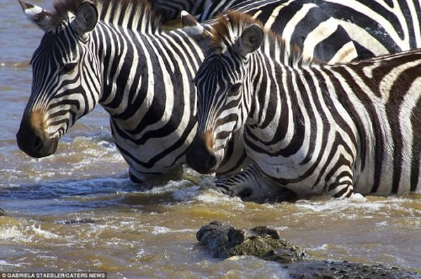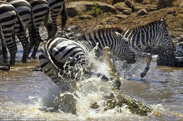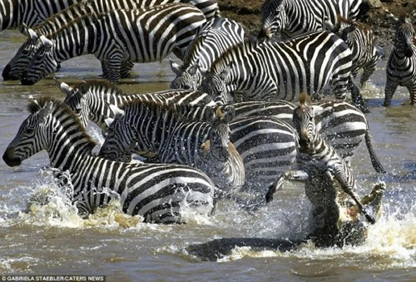据拍摄到这一场景的摄影师称,这群斑马是在渡过肯尼亚的玛拉河(Mara river)时遭到鳄鱼伏击的。首先,有几条小鳄鱼试图袭击迁徙队伍中的斑马,但没能成功。