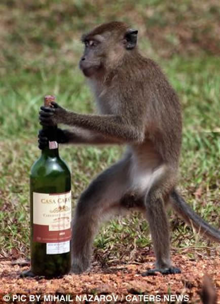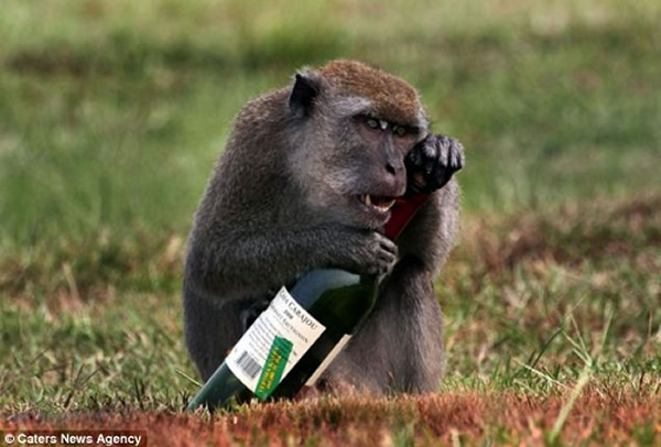 马来西亚一只猴子拔出木塞把红酒喝精光