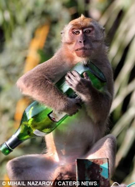 不少人喜欢在忙碌了一天之后小酌几杯,人类如此,猴子也是这样。日前,在马来西亚一所大学的校园内,一只猴子捡到了一瓶红酒。聪明的“酒鬼”猴子自己拔出酒瓶上的木塞,把红酒喝了个精光。这所大学的一位教授拍下了这有趣的一幕。