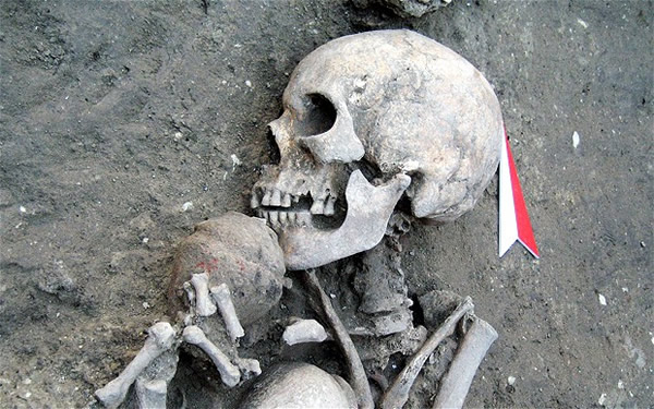 今年年初,考古学家还在当地发现了一个小型坟地。图为人体残骸和一个陶瓷碗。