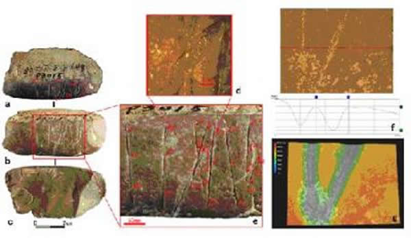 如何判定这些刻划痕迹是人工有意识所为是此次研究的一个重点内容。研究人员利用中科院古脊椎动物与古人类研究所人类演化实验室的数字显微镜对石制品上的刻划痕迹进行了三维观察和测量。在排除了自然原因、踩踏、动物啃咬和人类无意识行为等多种其他原因后,确认这一刻划痕迹是古人类有意识所为。这也是我国学者首次利用三维重建技术对石制品表面的刻划痕迹进行研究。