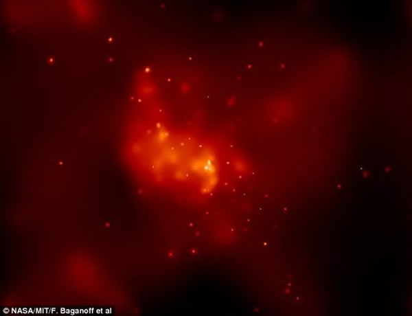 这张伪色彩图像显示美国宇航局钱德拉X射线天文台观测到银河系中心区域的人马座A黑洞,该黑洞释放迄今最明亮耀斑,这个黑洞位于图中明亮的点状光源