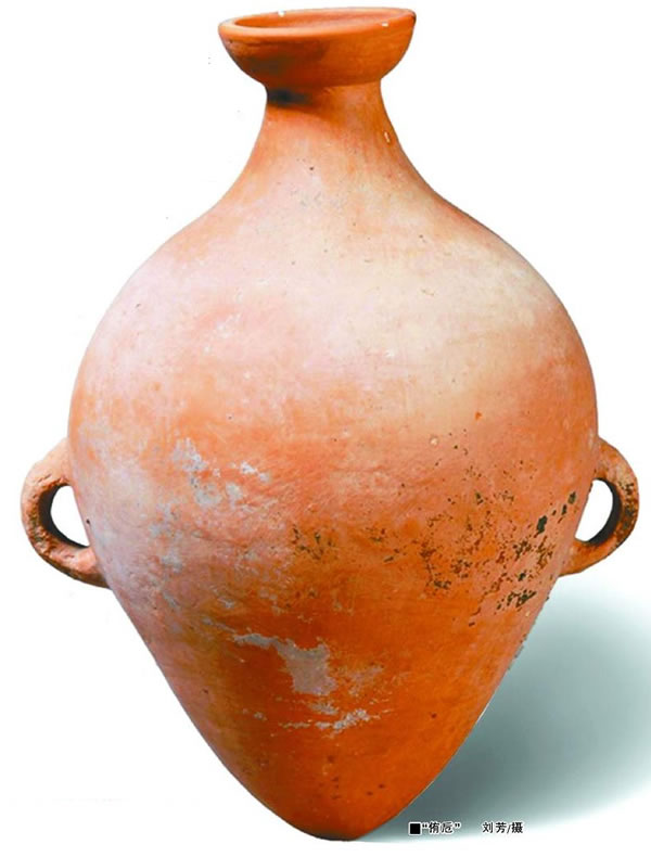 那种可装水100斤左右的大型尖底瓶,显然不是上述用途。大型尖底瓶不仅仅见于郑州地区作葬具使用,也见于其他仰韶文化,几乎每个遗址都有一件。半坡类型大型尖底瓶是有双耳的,它们出土于居住区,不是作葬具使用。笔者认为朱兴国根据一些伴随现象推测其为礼仪所用是有道理的,应该是专门制作的礼器(作为储水器极不合理:放置不易、倒出水不易、抬动易破,也无需双耳)。