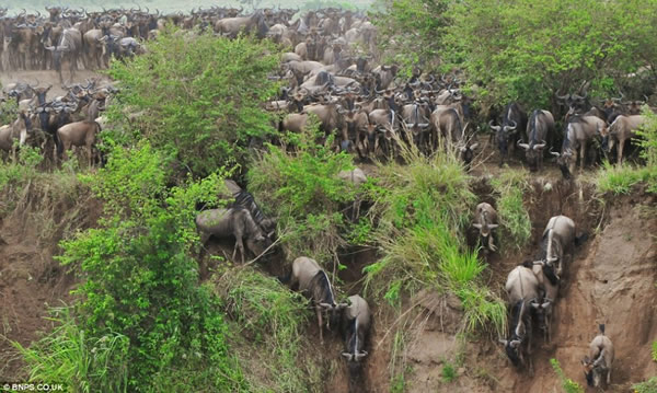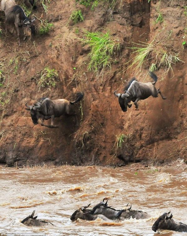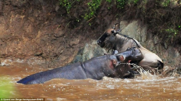 在2012年的大迁徙中,荷兰业余摄影师休伊曾加(Sjoerd van Berge Henegouwen)就拍到了迁徙角马遭到一头重3吨的河马袭击的画面。
