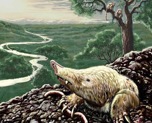 近日一项对哺乳动物化石的最新研究发现,几千万年前一支长有罕见怪异特征的哺乳动物家族移居地下生活,类似于生活在一个永久的防空洞里,并从6500万年前的大灭绝事件中幸存下来,这场大灭绝横扫了当时世上所有的非鸟类恐龙。这个名为Necrolestes patagonensis的哺乳动物物种长有朝上扬的鼻子,身体结构非常坚硬,并长有又短又宽的腿部。这项发现被发表在最新的《国家科学研究院学报》上。