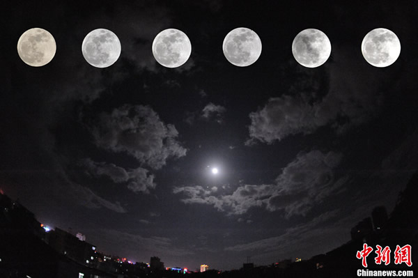 11月28日,是农历十月十五,海南琼海市上空一轮皓月高挂苍穹。在欣赏圆月的同时,一次半影月食也正在悄然发生。在整个4个多小时里,月亮依旧圆圆的,但月面有一个从亮到暗,从暗恢复到亮的过程。图为年11月28日,海南琼海上空的月亮(拼图)。