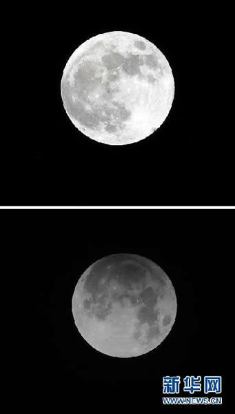 这是11月28日晚在北京拍摄的月亮。上图:20时13分“半影月食”开始时的月亮;下图:22时02分的月亮,虽然月光暗了,但月球表面层次却增加了。