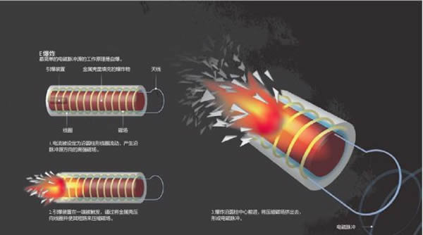 其实,电池驱动设备就能够产生高功率微波脉冲,不过,要想产生这种能摧毁电子设备的高度聚集的能量,通常还需要在设备内部引发一次普通的爆炸(参见插图“E爆炸”),但在有人驾驶的飞机里这样做是很危险的,齐默曼也指出,“在(飞机的)关键部位,几磅炸药就能让它坠毁”。所以最近几年,美国空军一直在寻求能用导弹投放的高功率微波武器。