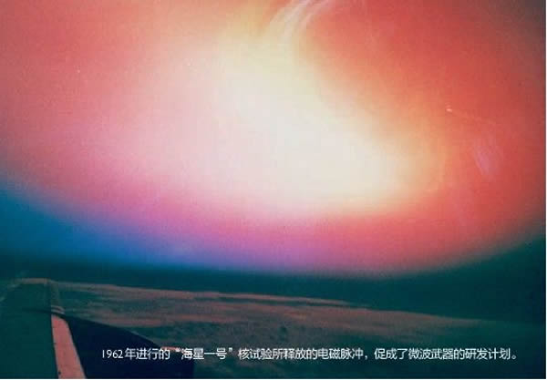 电磁武器 (军队里俗称“E弹”)的概念,最早是在1962年7月8日提出的。也是在那一天,美国进行了当时最高当量,代号为“海星一号”的高空核试验。当天夜里11点零9秒(夏威夷时间),一枚140万吨当量的热核弹头在太平洋中部400千米的高空被引爆。爆炸产生的大量高密度带电粒子沿着地球磁场向外迸发。它们的回旋运动产生了一束微波脉冲,导致测量仪器失准。爆炸所产生的极光带在洋面上空闪烁,照亮了整个夜空。在距离爆点1 300多千米外的檀香山(Honolulu),脉冲不仅导致防盗警报器此起彼伏,路灯也纷纷熄灭,最后连供电线路也跳闸瘫痪了。