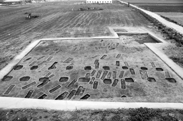 环壕内的居住区让人们对远古文明大为惊叹,那么环壕外的墓葬区又将有怎样的新发现?走出环壕,记者发现有两处墓葬群,分别位于遗址的西北和西南角。“现在发掘出来的墓葬均为长方形竖穴土坑墓,成排分布,以单人葬为主,存在少量的双人合葬和多人合葬墓。”林留根介绍说,“从独立出来的墓葬群可以明显看出,那时先民们已经有意识将墓地与居住区区分开来,并把死去的人有序埋葬,这对研究当时的丧葬习俗、宗教信仰等是非常宝贵的资源。”林留根叹息道,由于挖掘出来的墓葬均开口于现代耕土层之下,受到自然和人为破坏,骨架保存较差,部分仅剩粉状痕迹,给研究造成了一定的难度。