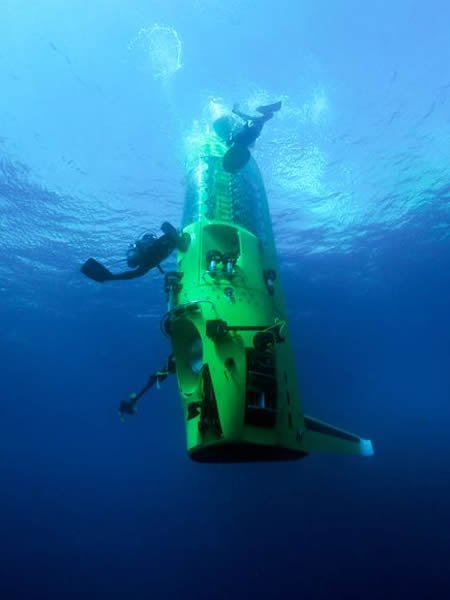 The DEEPSEA CHALLENGER, the one-man deep-diving submarine built by James Cameron, on a test dive off Papua New Guinea.