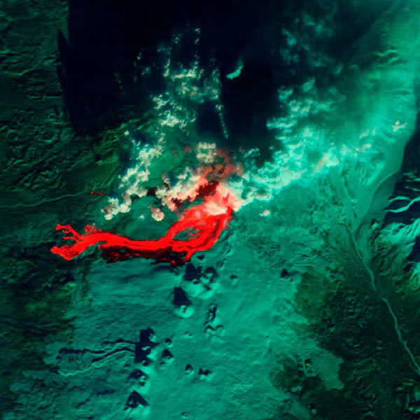 与此形成对比的是,在红外线下可观测到的景象犹如一条恐怖的红河,穿过类似胆汁的绿色环境。这样的红色物质反应了熔岩表面的高温,而绿色则代表了该火山所在地,俄罗斯勘察加半岛较冷的环境。