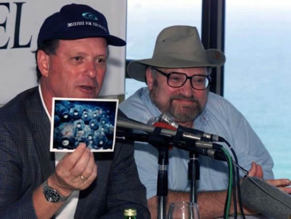 “泰坦尼克”号沉船发现者罗伯特-巴拉德手里拿着一张展示在以色列沿岸发现的古代水壶的照片。公元前大约750年,这些水壶在一场风暴中被冲走。巴拉德声称发现了能够证明诺亚大洪水确有其事的证据