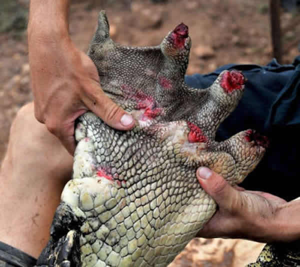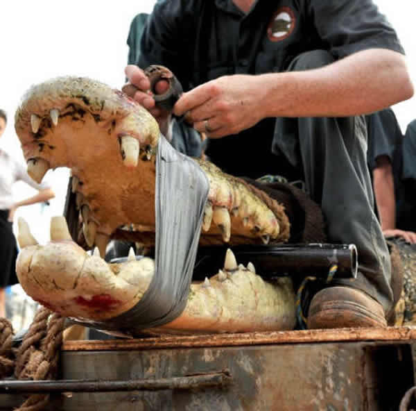 工作人员约翰·波默罗伊(John Pomeroy)称,在捆住鳄鱼的过程中,他被鳄鱼的头部撞击了两次。他称,“这家伙力量太大了,当时疼死我了。”