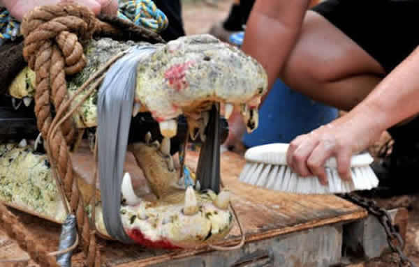 经过多次“激战”,工作人员最终还是把鳄鱼“驯服”,用绳子将它捆住。转移之前,工作人员检查了“史瑞克”的爪子,并用刷子帮它清洗了牙齿。