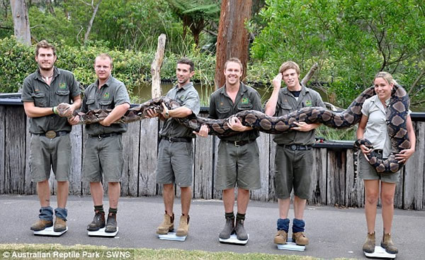 圣诞节过后,大部分人可能都会感觉到,因节日期间的大吃大喝身体稍微变得丰满了。由此我们想到了一条名叫超级贝蒂的6.40米长的蛇。这条网纹蟒吃掉5只重大约是25公斤的山羊后,今年体重已经增加2.04公斤。