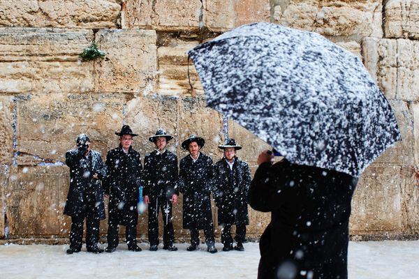 Snow falls in Jerusalem as visitors pose for pictures in front of the Western Wall.