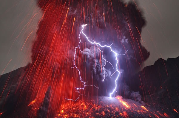 Volcanic lightning strikes during an eruption of Japan's Sakurajima volcano in February 2013.