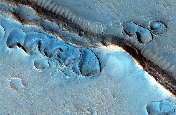 Observation of the strange features discovered by the HiRISE camera on NASA's Mars Reconaissance Orbiter (MRO) at the southern edge of Acidalia Planitia on Mars. The main cluster of pits on the left side of the photo are approximately 500 meters long and 100 meters wide.