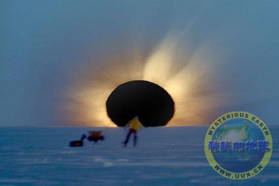 美国宇航局网站公布了一张2003年拍摄的罕见南极日全食照片,太阳、月亮、南极洲和两位摄影师一齐出现在照片中。