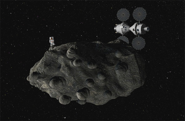 NASA's Orion deep space capsule investigates an asteroid in this artist's impression of the mission.