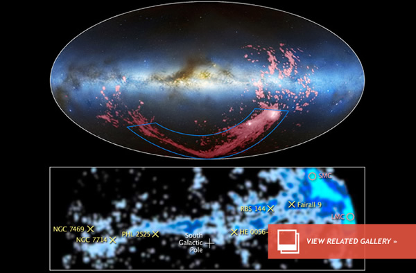 Image: These images show wide and close-up views of a long ribbon of gas called the Magellanic Stream, which stretches nearly halfway around the Milky Way. Credit for the radio/visible light image: David L. Nidever, et al., NRAO/AUI/NSF and Mellinger, LAB Survey, Parkes Observatory, Westerbork Observatory, and Arecibo Observatory. Credit for the radio image: LAB Survey(Sep 23, 2013 04:17 PM ET // by Ian O'Neill)