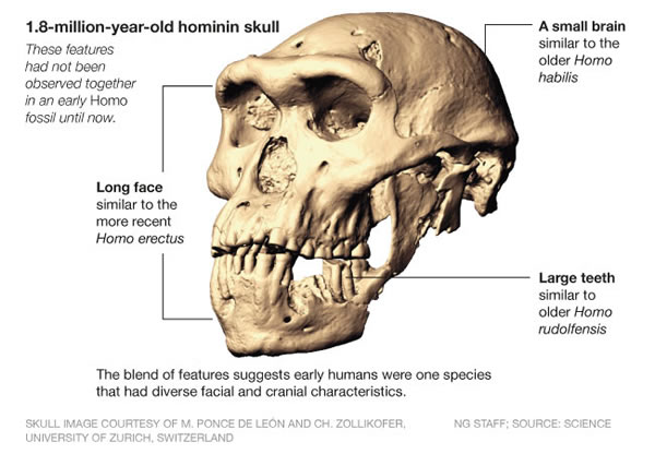 The combination of features seen in the Dmanisi skulls is a record of "evolution in action," Spoor adds. They might place the Dmanisi humans somewhere after the split between the earlier Homo habilis and Homo erectus, sometime prior to 1.8 million years ago.