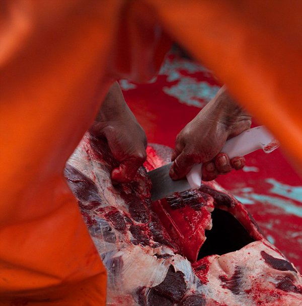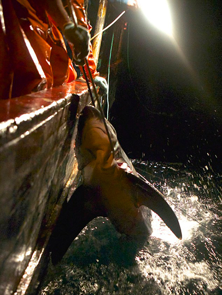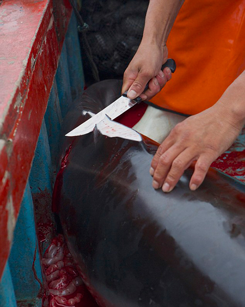 在秘鲁海域,一场血腥残酷的海洋大屠杀,直到现在仍在进行中。目睹全过程的吉姆描述道,在发现海豚后,船员迅速瞄准它,投出重达30公斤的长矛,被刺中的海豚即便挣扎也是徒劳,很快便被拖至船边,被船员用钩子拉上船,这时它的内脏往往已经从伤口滑出了身体。船员拿刀麻利地砍掉海豚的鳍扔走,随后将它剥皮,割下一块块肉,为下一步的捕鲨工作准备好诱饵。虽然已经血染船舱,但是屠杀尚未终止。真正的主角——鲨鱼,很快也会出场。不过即使不详细说明,事情将如何展开也可想而知。
