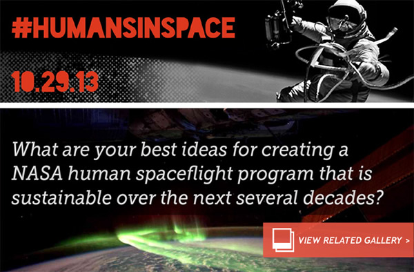 So what are you waiting for? If you have a passion for space exploration (and even if you don’t), becoming a part of the conversation around NASA’s future human spaceflight program is critical to make your opinions known. Remember, future NASA policy isn’t just about funding, the U.S. spaceflight program and the politicians who shape its direction in space needs to take note of the public’s hopes and dreams.(Oct 29, 2013 12:28 PM ET // by Ian O'Neill)