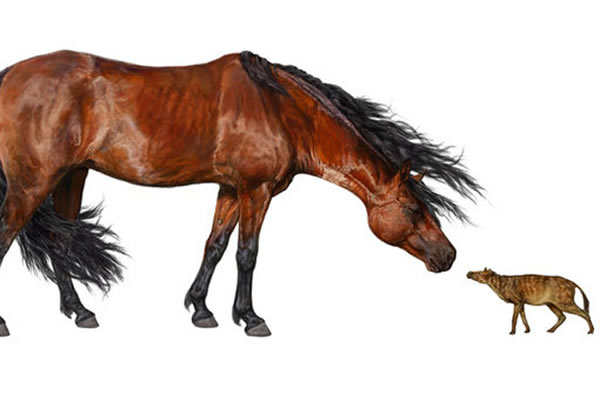 Artist's reconstruction of Sifrhippus sandrae (right) touching noses with a modern Morgan horse (left) that stands about 5 feet high at the shoulders and weighs approximately 1,000 lbs.