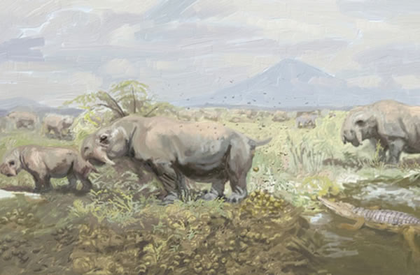An artist's imagining of communal defecation by an ancient rhinoceros-like mammal called Dinodontosaurus.