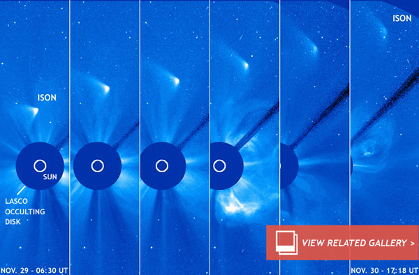This sad turn of events is brought to you by the joint NASA/ESA Solar and Heliospheric Observatory (SoHO)’s LASCO instrument that gives a wide-angle view of the sun’s atmosphere (pictured above). For the duration of Comet ISON’s close approach to our nearest star, LASCO has been carefully tracking the comet’s progress. After many heart-stopping hours post-perihelion on Nov. 28, space experts nearly gave up hope — ISON had vanished from LASCO’s view, apparently not surviving the sun’s extreme tidal forces and powerful radiation.