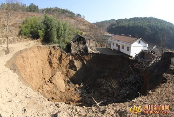 12日凌晨零时40分许,广元市朝天区平溪乡毛坝村三组村民王全成家房屋突然发生地陷,形成直径约30公尺宽的天坑,总计有受灾农户有4户14人。
