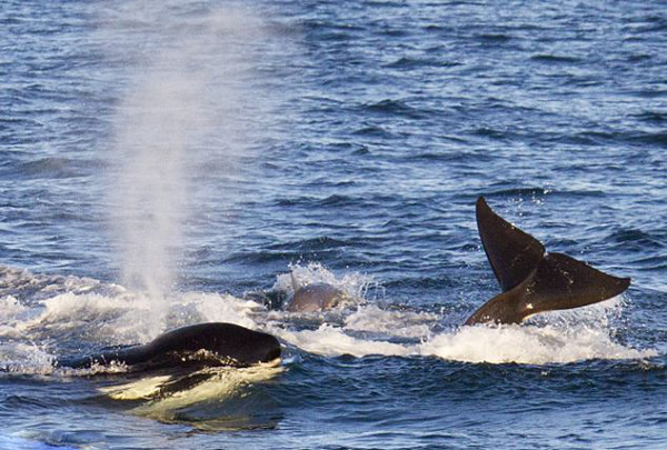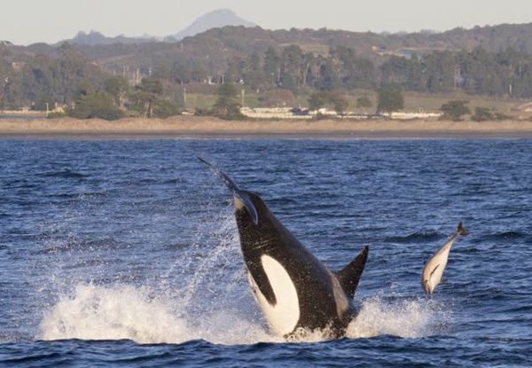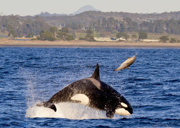 照片中,雌性虎鲸腾空而起,不远处的海豚也清晰可见。据乔迪描述,他看到这只雌性虎鲸穿梭于海面,速度非常迅猛,但是起初确实没有看清它捕猎的对象。不一会儿,虎鲸游速加快,瞬间将其鲸尾抛出海面,重击捕猎对象,顷刻间,乔迪才发现,是只倒霉的海豚不幸被抛至空中。乔迪表示,“这一幕仅仅只停留了一秒,我瞬间屏住了呼吸。”