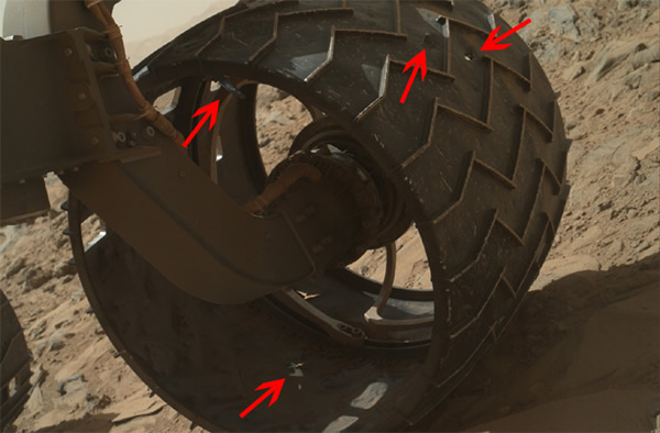Curiosity has recent endured some challenging terrain laced with sharp rocks protruding from the ground. These rocks have caused some perforations in the six wheels, sometimes peeling back flaps of cut aluminum.