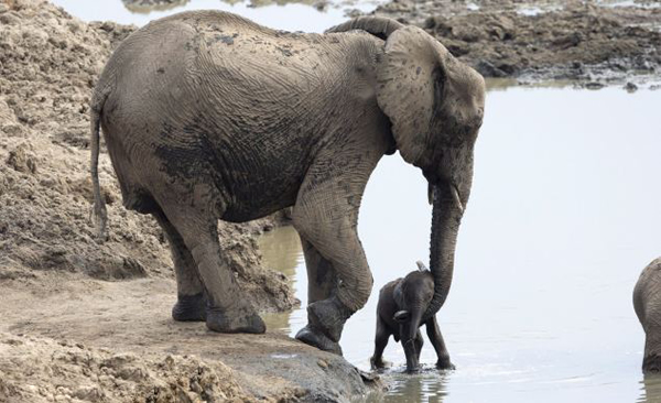 津巴布韦万基国家公园大象妈妈泥沼营救宝宝
