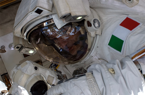 European Space Agency astronaut Luca Parmitano, Expedition 36 flight engineer, is photographed here participating in the July 16, 2013, space station spacewalk. 45 minutes into the extra-vehicular activity, Parmitano reported water floating behind his head inside his helmet.