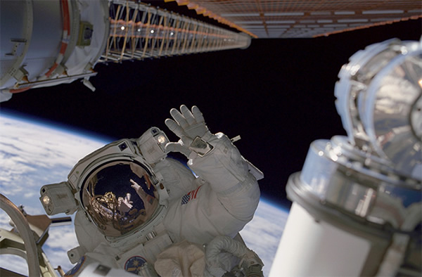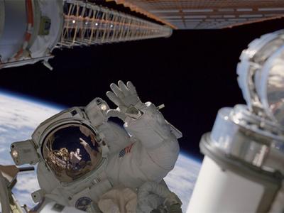 Astronaut Carlos I. Noriega, mission specialist, waves during the second of three spacewalks on STS-97 in 2000.