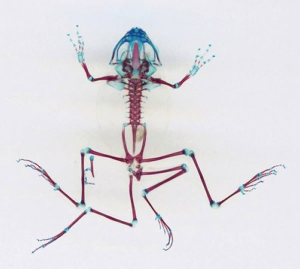 (神秘的地球)据ETtoday:美国生物学家、同时也是一位艺术家的巴伦吉(Brandon Ballengée)透过对一定时期的畸形蛙进行化学清洗和染色,再以X光扫描,创造出一种风格诡异的艺术形式,主要目的是告诉社会大众,化学污染是如何危害自然界的野生动物。