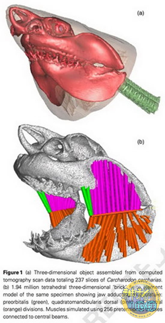 现在看来大白鲨威力无比,但它们的远古同类――巨齿鲨则远远胜过它们。经测算,巨齿鲨所产生的撕咬力比大白鲨强6-10倍多,从而使巨齿鲨成为有史以来最可怕的食肉动物。相比之下,科学家估计暴龙雷克斯――这种伟大的“暴君蜥蜴”根本就不是这种灭绝鲨鱼的对手。此恐龙的最大咬力是3.1公吨,比现在活着的大白鲨威猛得多,但相对巨齿鲨则是小巫见大巫,伍罗表示。“我得说我对鲨鱼这种复杂的进料装置深有印象,我检查过的所有食肉哺乳动物,其中许多动物几乎都丧失了用于撕咬的肌肉力量。而此鲨鱼却正在进化出更加有效的杠杆系统。”
