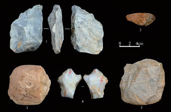 图3 贾湾1号地点发掘所获部分石器和石锤。1,两面器;2,5,刮削器;3,石锤;4,齿状器。(牛东伟供图)