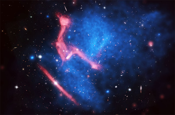 In this stunning composite image described today (Tuesday) at the American Astronomical Society’s meeting in Boston, Mass., the blue glow represents hot intergalactic gases emitting X-ray radiation as seen by Chandra. But the red wiggly structure threading through the vast cloud of colliding galaxies — which represents intense radio wave emissions as recorded by the ground-based VLA — is something of a conundrum.