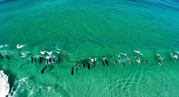澳洲西澳省艾斯帕兰斯海岸超过100条樽鼻海豚在冲浪 来源: 神秘的地球 时间:2014年6月23日 14:45 澳洲西澳省艾斯帕兰斯海岸超过100条樽鼻海豚在冲浪 (神秘的地球报道)澳洲男子里格斯平时以无人4轴飞行器,从高空拍摄大白鲨,他最近在西澳省艾斯帕兰斯海岸,拍到超过100条樽鼻海豚在嬉水畅泳。只见海豚或在浪间穿梭,又或是乘着浪头冲浪,场面煞是壮观。 专家指海豚与人一样,喜爱冲浪,有时更会跃得比浪头还要高。 上一篇 下一篇 TAG: 澳洲 海豚