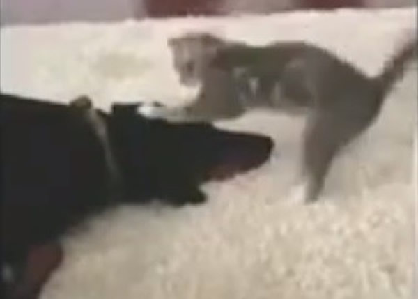小猫挑衅都柏文 来源: 神秘的地球 时间:2014年6月24日 18:24 小猫挑衅都柏文 (神秘的地球报道)近日一段外国小猫挑衅都柏文的片段于网上热传,上传仅3天已有超过5000次点击率。一头小猫不断挑衅体型为其4倍的都柏文犬,以空手道的姿态意图惹怒它。 充满戒备的小猫一见都柏文稍有异动,马上跳到9丈远。虽小猫多次以前掌拍打都柏文的头部,幸后者极具耐性,受击后仍无动于衷,于地毯上躲懒,否则一旦展开厮杀小猫无疑会“战败”。 上一篇 下一篇 TAG: 猫 都柏文